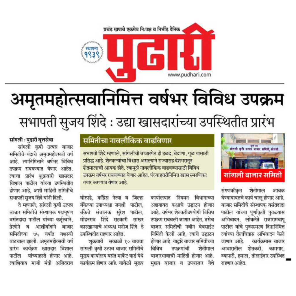 सांगली कृषी उत्पन्न बाजार समितीचे यंदाचे अमृतमहोत्सवी वर्ष आहे. त्यानिमित्ताने वर्षभर विविध उपक्रम राबवण्यात येणार आहेत. त्याचा प्रारंभ शुक्रवारी खासदार विशाल पाटील यांच्या उपस्थितीत होणार आहे, अशी माहिती समितीचे सभापती सुजय शिंदे यांनी दिली. शुक्रवारी दिनांक १७/०१/२०२५ रोजी सकाळी १० वाजता सांगली कृषी उत्पन्न बाजार समितीचे मुख्य कार्यालय वसंत मार्केट यार्ड येथे कार्यक्रम होणार आहे. यावेळी मुख्य कार्यालयात नियमन विभागाच्या अद्ययावत कक्षाचे उद्घाटन होणार आहे. वर्षभर शेतकरीउपयोगी विविध उपक्रम राबवले जाणार आहेत, तसेच बाजार समितीची नवीन वेबसाईट निर्मिती केली आहे, त्याचे उद्घाटन होणार आहे. याद्वारे बाजार समितीच्या विविध उपक्रमांची शेतीमाल बाजारभावाची माहिती होणार आहे.