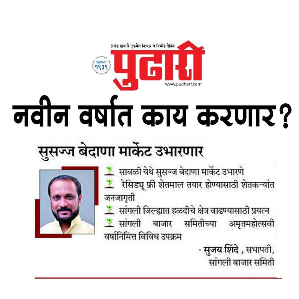 सावळी येथे सुसज्ज बेदाणा मार्केट उभारणार रेसिड्यू फ्री शेतमाल तयार होण्यासाठी शेतकऱ्यांत जनजागृती करणार सांगली जिल्ह्यात हळदीचे क्षेत्र वाढण्यासाठी प्रयत्न करणार सांगली बाजार समितीच्या अमृतमहोत्सवी वर्षानिमित्त विविध उपक्रम राबवणार श्री. सुजय शिंदे, सभापती, सांगली बाजार समिती.