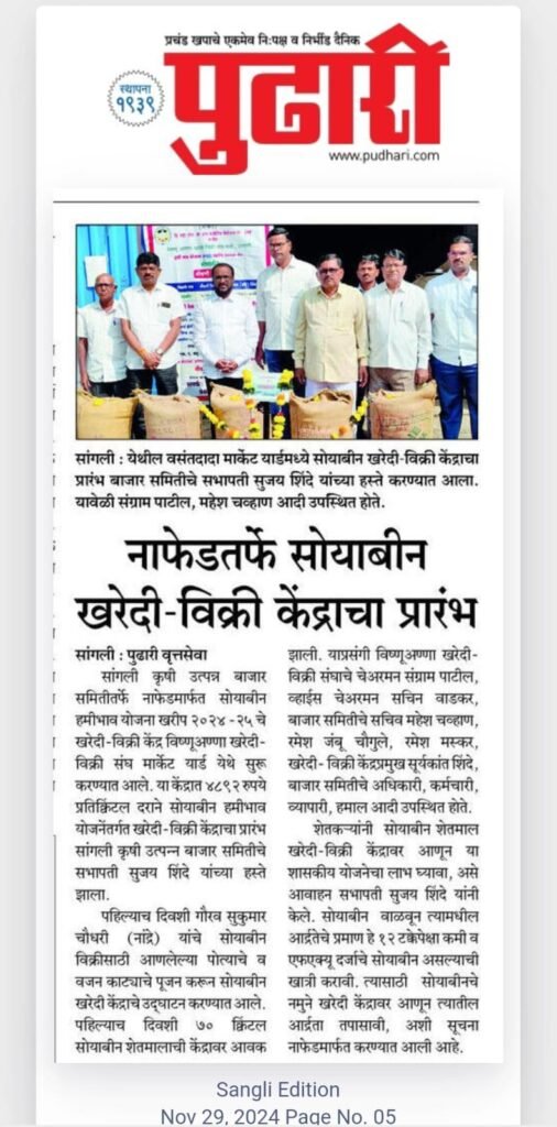 सांगली कृषी उत्पन्न बाजार समितीमध्ये नाफेडमार्फत सोयाबीन हमीभाव योजना खरीप २०२४-२५ चे खरेदी-विक्री केंद्र विष्णूअण्णा खरेदी विक्री संघ मार्केट यार्ड येथे सुरू करण्यात आले. या केंद्रात ४८९२ रुपये प्रतिक्विंटल दराने सोयाबीन हमीभाव योजनेंतर्गत खरेदी-विक्री केंद्राचा प्रारंभ सांगली कृषी उत्पन्न बाजार समितीचे सभापती सुजय शिंदे यांच्या हस्ते झाला.