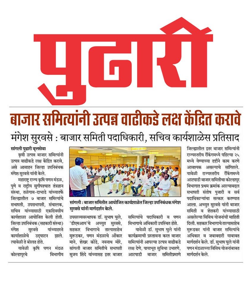 महाराष्ट्र राज्य कृषि पणन मंडळ, पुणे व राष्ट्रीय सुगीपश्चात तंत्रज्ञान संस्था, तळेगाव दाभाडे यांच्यातर्फे जिल्ह्यातील ७ बाजार समित्यांचे सभापती, उपसभापती, संचालक, सचिव यांच्यासाठी एकदिवसीय कार्यशाळा आयोजित केली होती. यावेळी कृषि कोल्हापूरचे पणन मंडळ विभागीय उपसरव्यवस्थापक डॉ. सुभाष घुले, ‘डीएमआय’चे अच्युत सुरवसे, सहकार विभागाचे तात्यासाहेब मुरूडकर, पणन मंडळाचे ओंकार माने, शेखर कोंडे, नवनाथ मोरे, सांगली बाजार समितीचे सभापती सुजय शिंदे यांच्यासह इतर बाजार समित्यांचे पदाधिकारी व पणन विभागाचे अधिकारी उपस्थित होते.