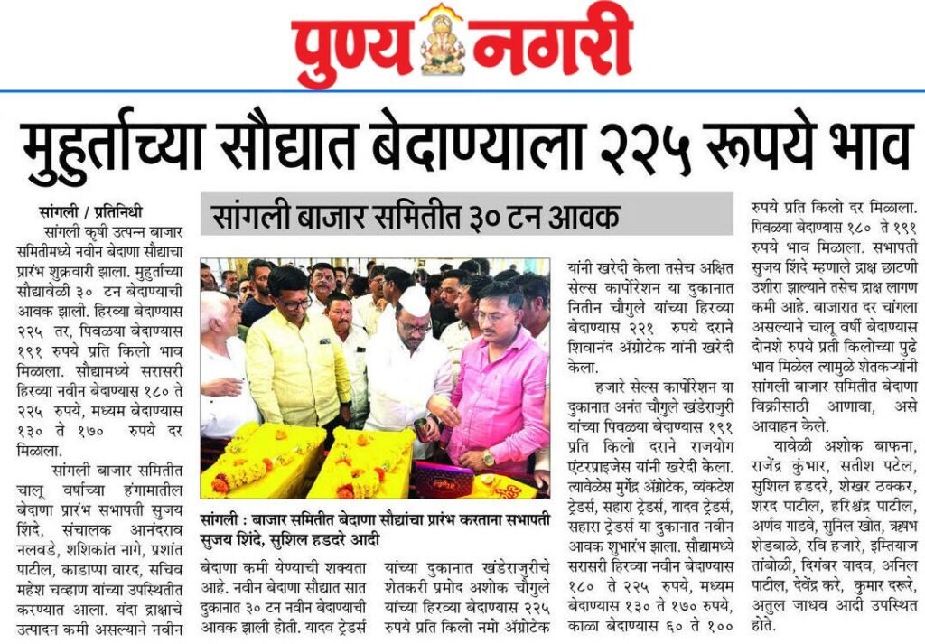 सांगली कृषी उत्पन्न बाजार समितीमध्ये नवीन बेदाणा सौद्याचा प्रारंभ शुक्रवारी झाला. मुहूर्ताच्या सौद्यावेळी ३० टन बेदाण्याची आवक झाली. हिरव्या बेदाण्यास २२५ तर, पिवळया बेदाण्यास १९१ रुपये प्रति किलो भाव मिळाला, सौद्यामध्ये सरासरी हिरव्या नवीन बेदाण्यास १८० ते २२५ रुपये, मध्यम बेदाण्यास १३० ते १७० रुपये दर मिळाला.