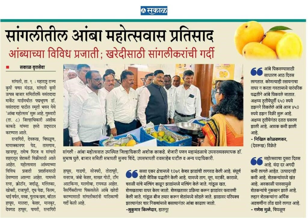 महाराष्ट्र राज्य कृषी पणन मंडळ, कोल्हापूर आणि सांगली कृषी उत्पन्न बाजार समितीतर्फे वसंतदादा मार्केट यार्डमधील पद्मभूषण डॉ. वसंतदादा पाटील स्मृती भवन येथे ‘आंबा महोत्सव’ सुरू आहे. या आंबा महोत्सव सांगलीकर मोठा प्रतिसाद देत आहेत. नैसर्गिकरित्या पिकवलेल्या विविध प्रजातीच्या आंब्यांची खरेदी करावी असे आवाहन बाजार समिती सांगली मार्फत करण्यात येत आहे.