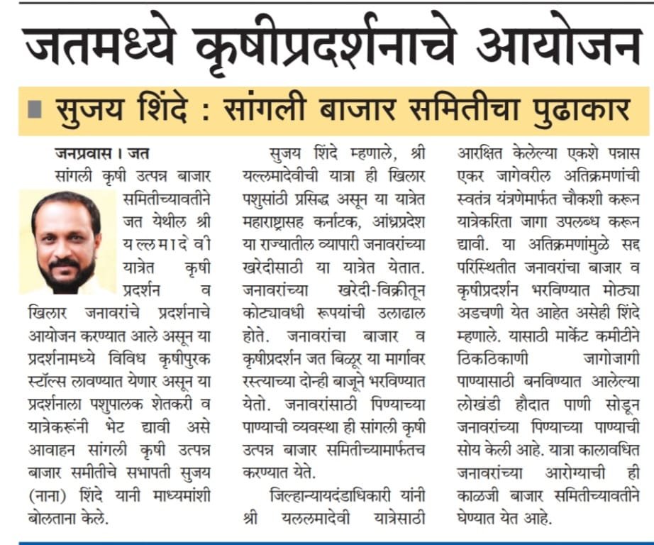 कृषी उत्पन्न बाजार समितीच्यावतीने जत येथील श्री यल्लमादेवी यात्रेत कृषी प्रदर्शन व खिलार जनावरांचे प्रदर्शनाचे आयोजन करण्यात आले असून या प्रदर्शनामध्ये विविध कृषीपुरक स्टॉल्स लावण्यात येणार असून या प्रदर्शनाला पशुपालक शेतकरी व यात्रेकरूंनी भेट द्यावी असे आवाहन सांगली कृषी उत्पन्न बाजार समीतीचे सभापती सुजय (नाना) शिंदे यानी माध्यमांशी बोलताना केले.
