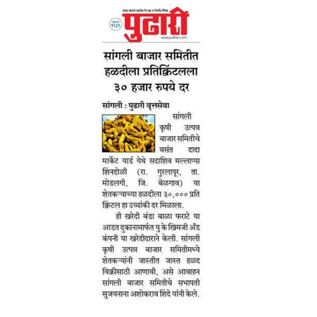 सांगली कृषी उत्पन बाजार समितीचे वसंतदादा मार्केट यार्ड येथे सदाशिव मल्लाप्पा शिंनदोळी (रा. गुरलापूर, ता. मोडलगी, जि. बेळगाव) या शेतकऱ्याच्या हळदीला ३०,००० प्रति क्विंटल हा उच्चांकी दर मिळाला. सांगली कृषी उत्पन्न बाजार समितीमध्ये शेतकऱ्यांनी जास्तीत जास्त हळद विक्रीसाठी आणावी, असे आवाहन सांगली बाजार समितीचे सभापती सुजयनाना अशोकराव शिंदे यांनी केले.