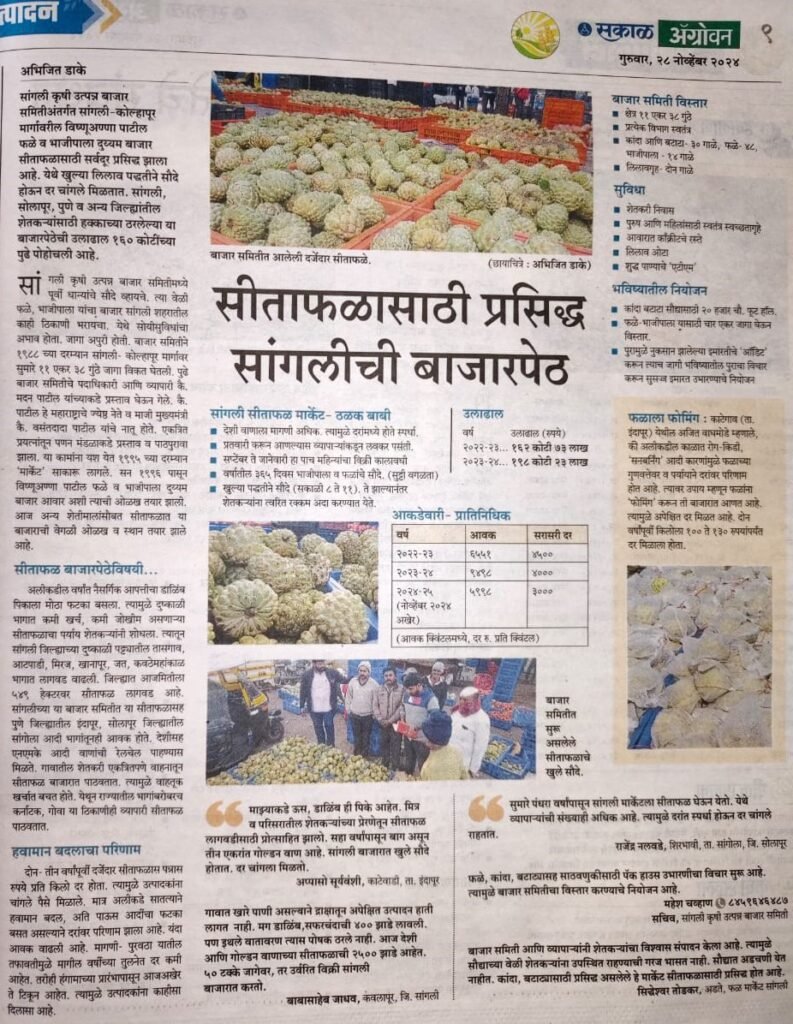 सांगली कृषी उत्पन्न बाजार समितीअंतर्गत सांगली-कोल्हापूर मार्गावरील विष्णूअण्णा पाटील फळे व भाजीपाला दुय्यम बाजार सीताफळासाठी सर्वदूर प्रसिद्ध झाला आहे. येथे खुल्या लिलाव पद्धतीने सौदे होऊन दर चांगले मिळतात, सांगली, सोलापूर, पुणे व अन्य जिल्ह्यांतील शेतक-यांसाठी हक्काच्या ठरलेल्या या बाजारपेठेची उलाढाल १६० कोटींच्या पुढे पोहोचली आहे. बाजार समितीने १९८८ च्या दरम्यान सांगली-कोल्हापूर मार्गावर सुमारे ११ एकर ३८ गुंठे जागा विकत घेतली. पुढे बाजार समितीचे पदाधिकारी आणि व्यापारी कै मदन पाटील यांच्याकडे प्रस्ताव घेऊन गेले,कै पाटील हे महाराष्ट्राचे जेष्ठ नेते व माजी मुख्यमंत्री कै. वसंतदादा पाटील यांचे नातू होते. एकत्रित प्रयत्नातून पणन मंडळाकडे प्रस्ताव व पाठपुरावा झाला.