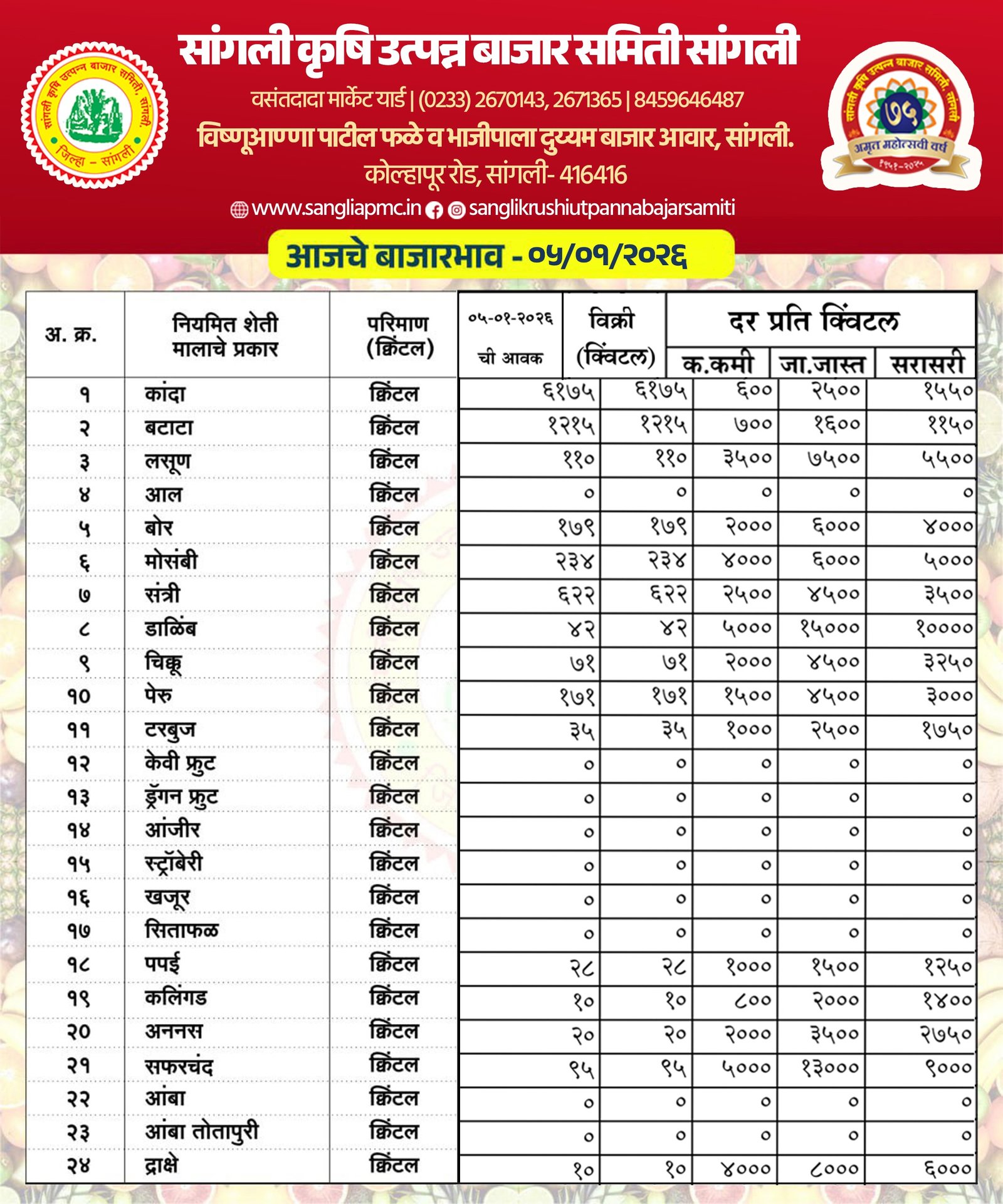 | 05/01/2026 | सांगली कृषि उत्पन्न बाजार समिती, सांगली | बाजारभाव पहा |