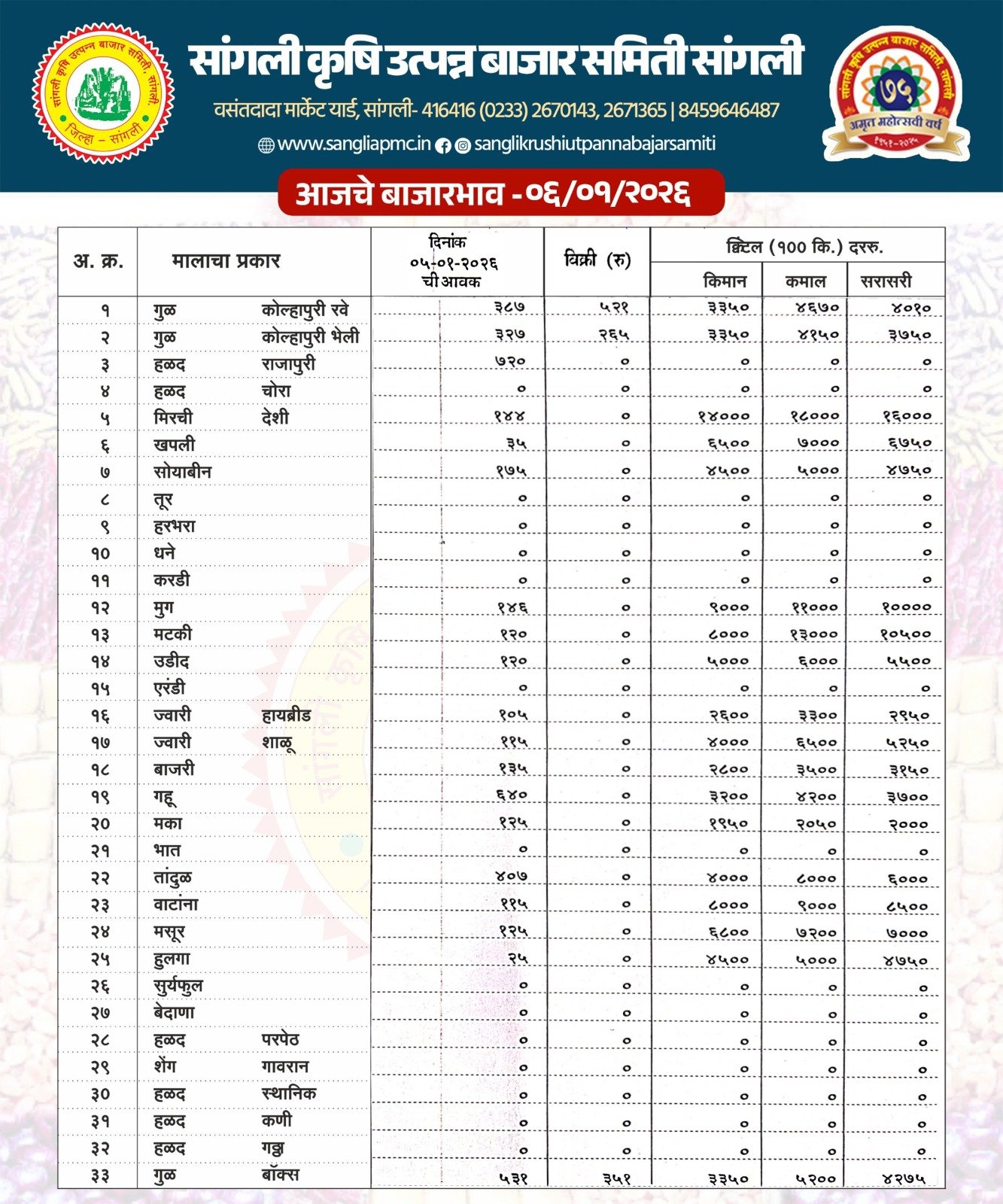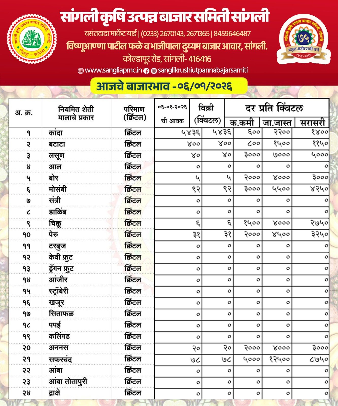 | 06/01/2026 | सांगली कृषि उत्पन्न बाजार समिती, सांगली | बाजारभाव पहा |