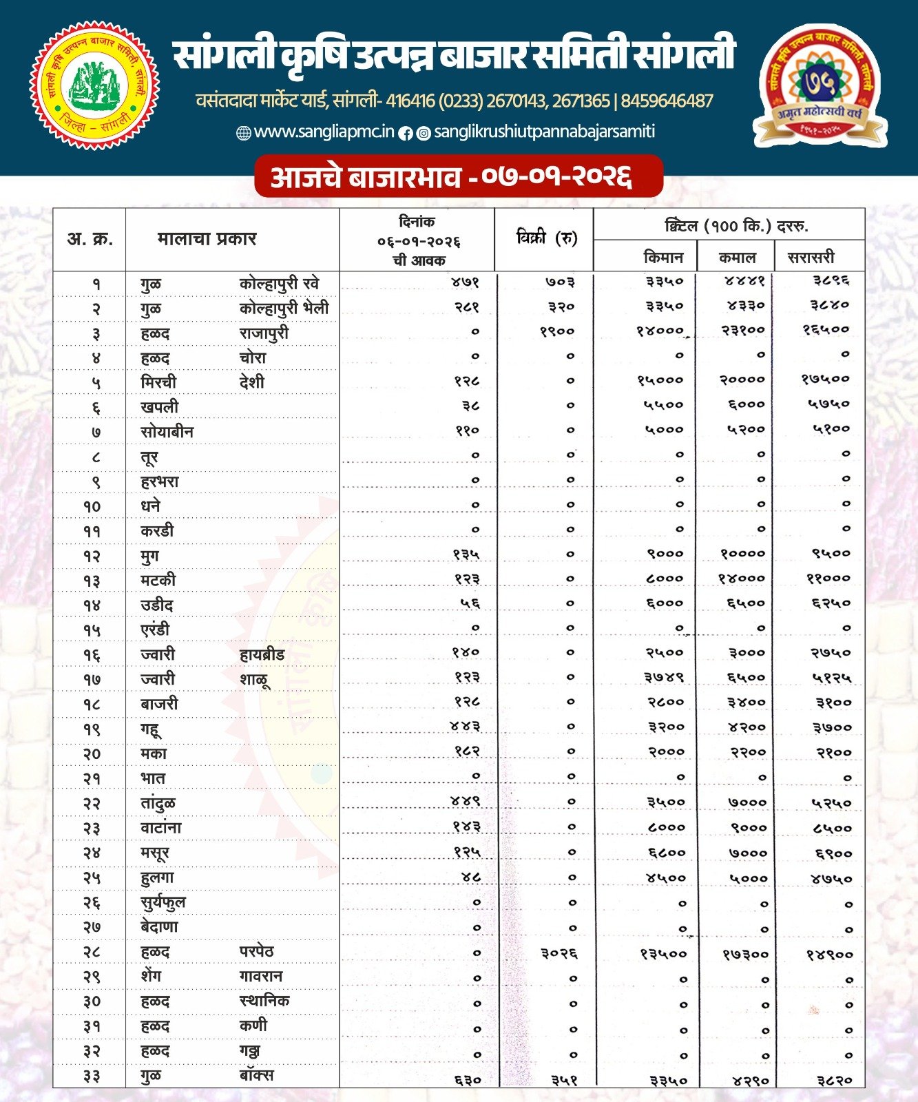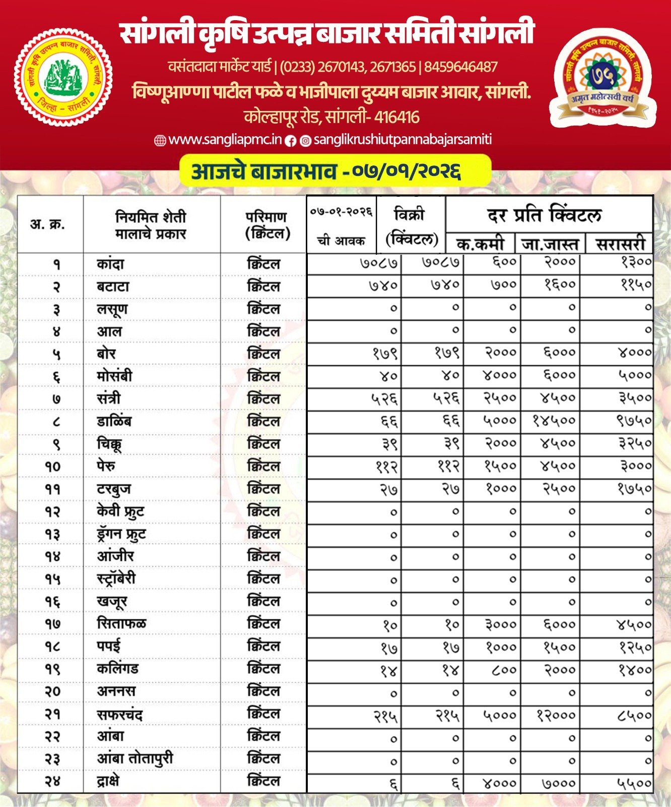 | 07/01/2026 | सांगली कृषि उत्पन्न बाजार समिती, सांगली | बाजारभाव पहा |