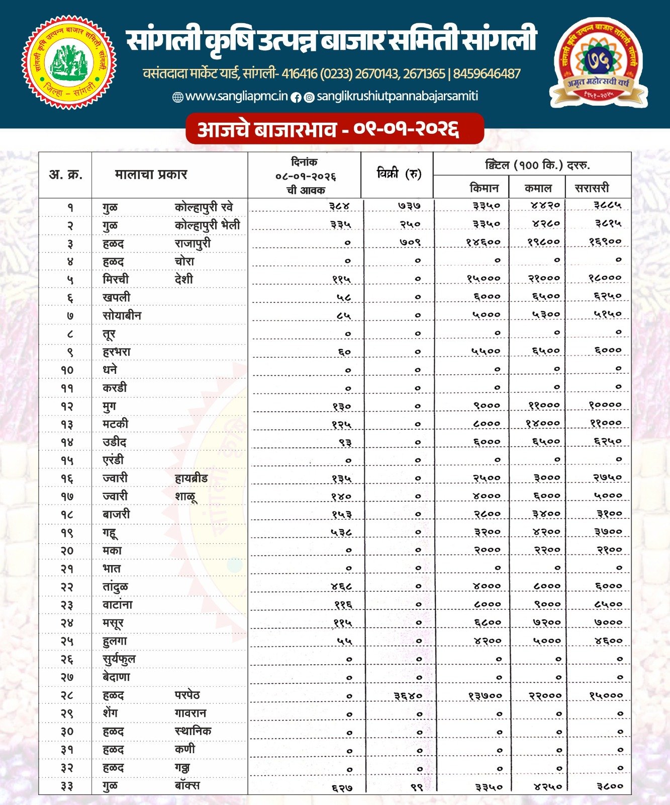 | 09/01/2026 | सांगली कृषि उत्पन्न बाजार समिती, सांगली | बाजारभाव पहा |