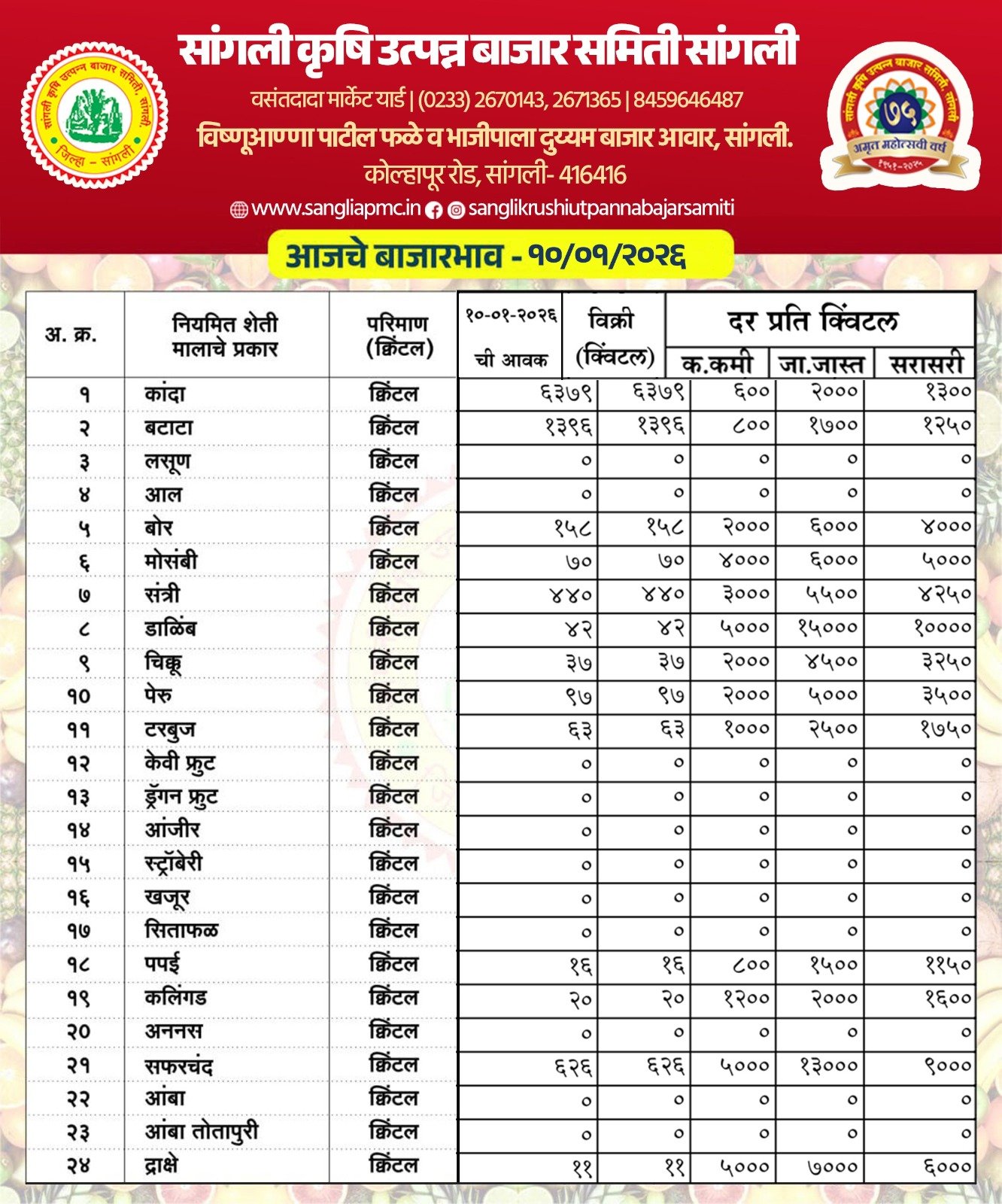 | 10/01/2026 | सांगली कृषि उत्पन्न बाजार समिती, सांगली | बाजारभाव पहा |