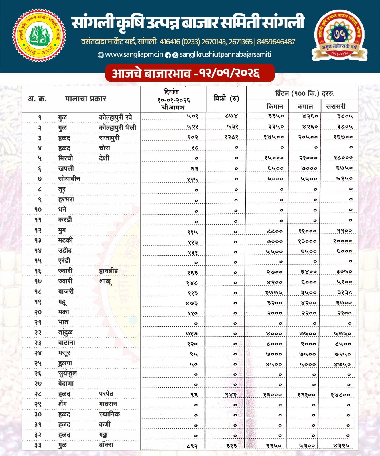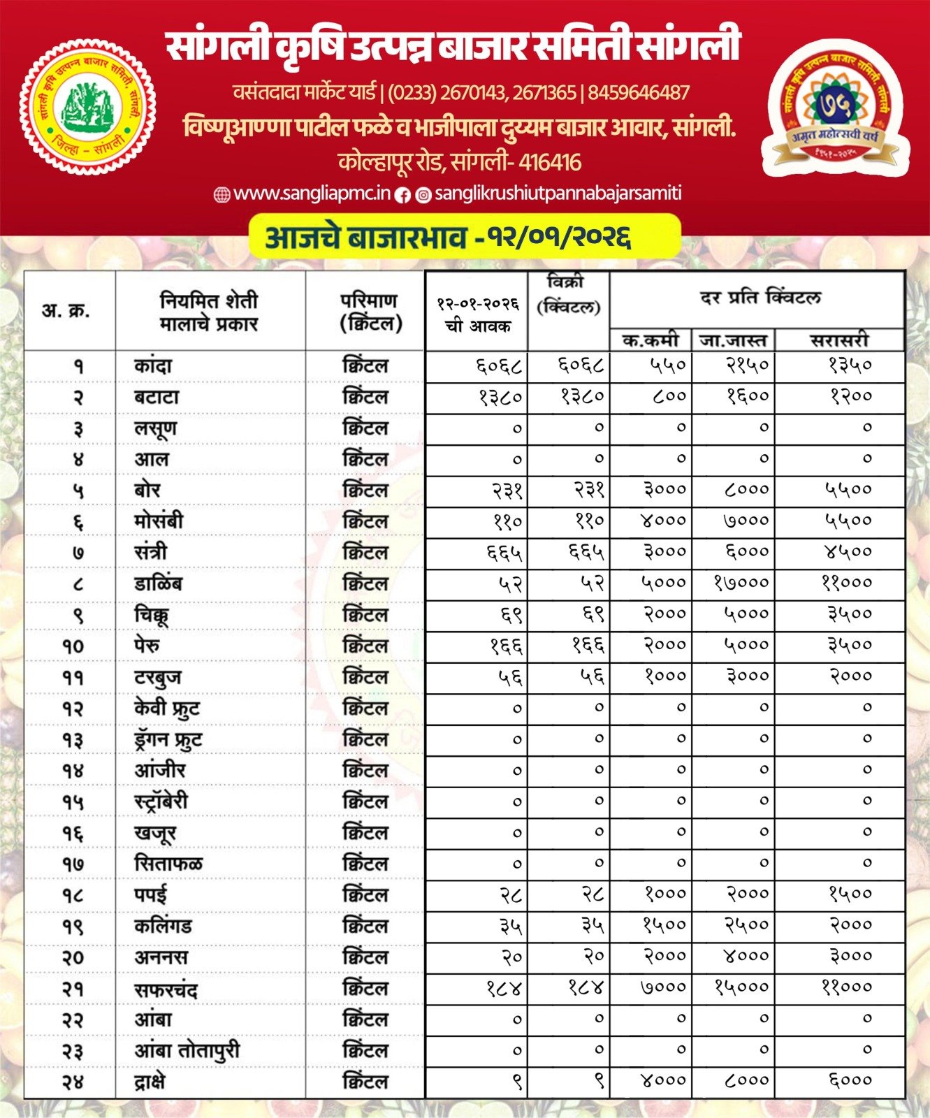 | 12/01/2026 | सांगली कृषि उत्पन्न बाजार समिती, सांगली | बाजारभाव पहा |