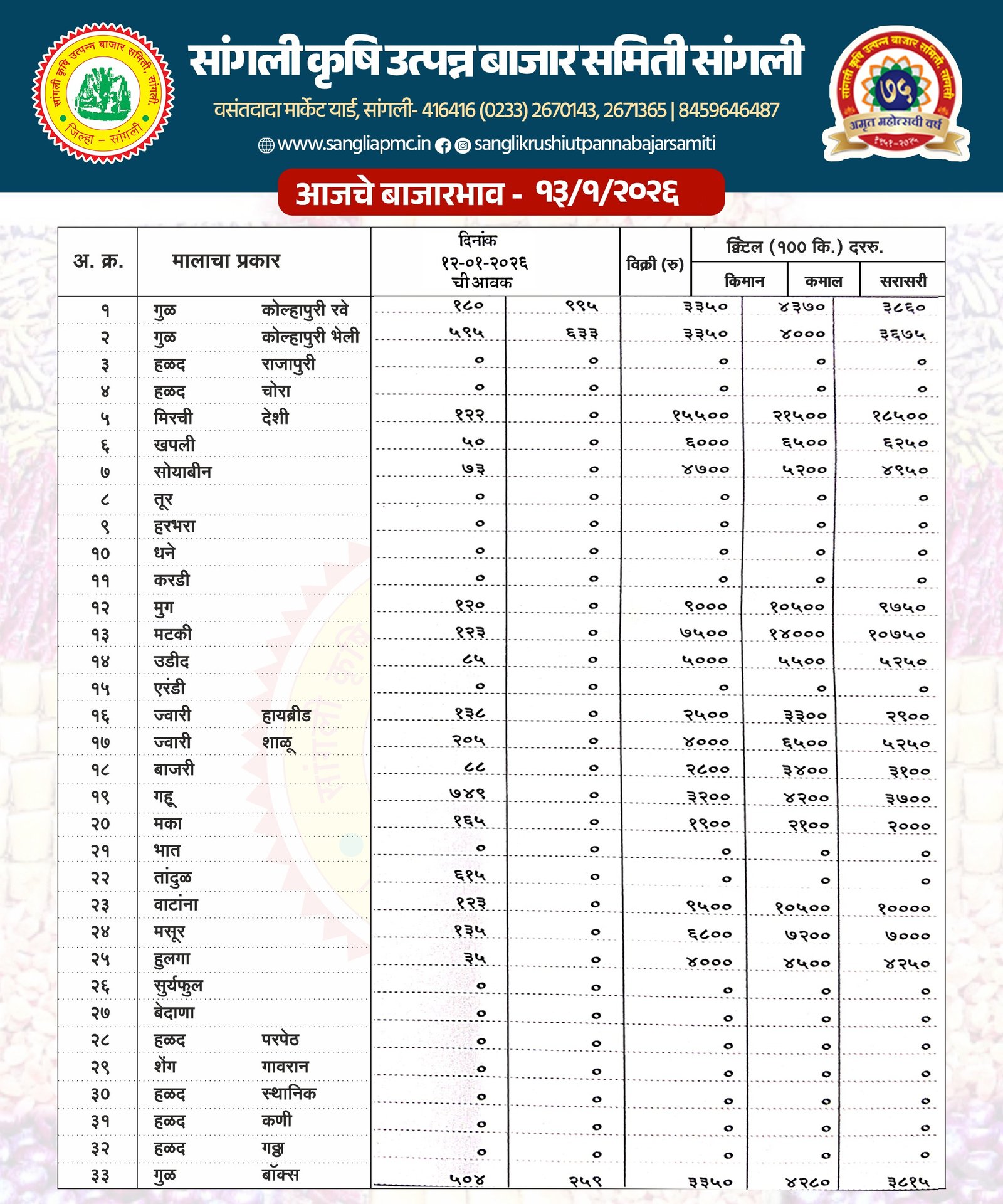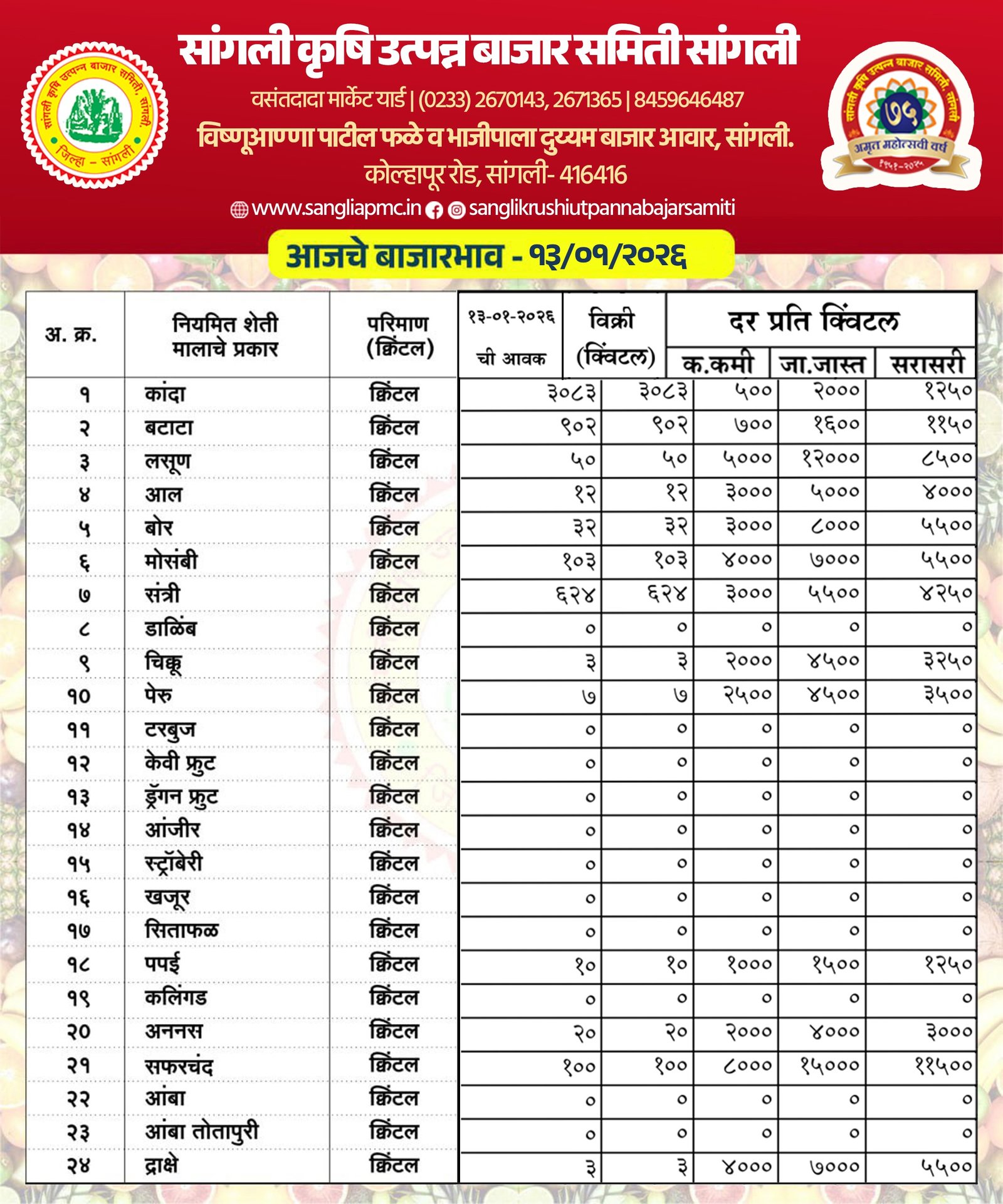 | 13/01/2026 | सांगली कृषि उत्पन्न बाजार समिती, सांगली | बाजारभाव पहा |
