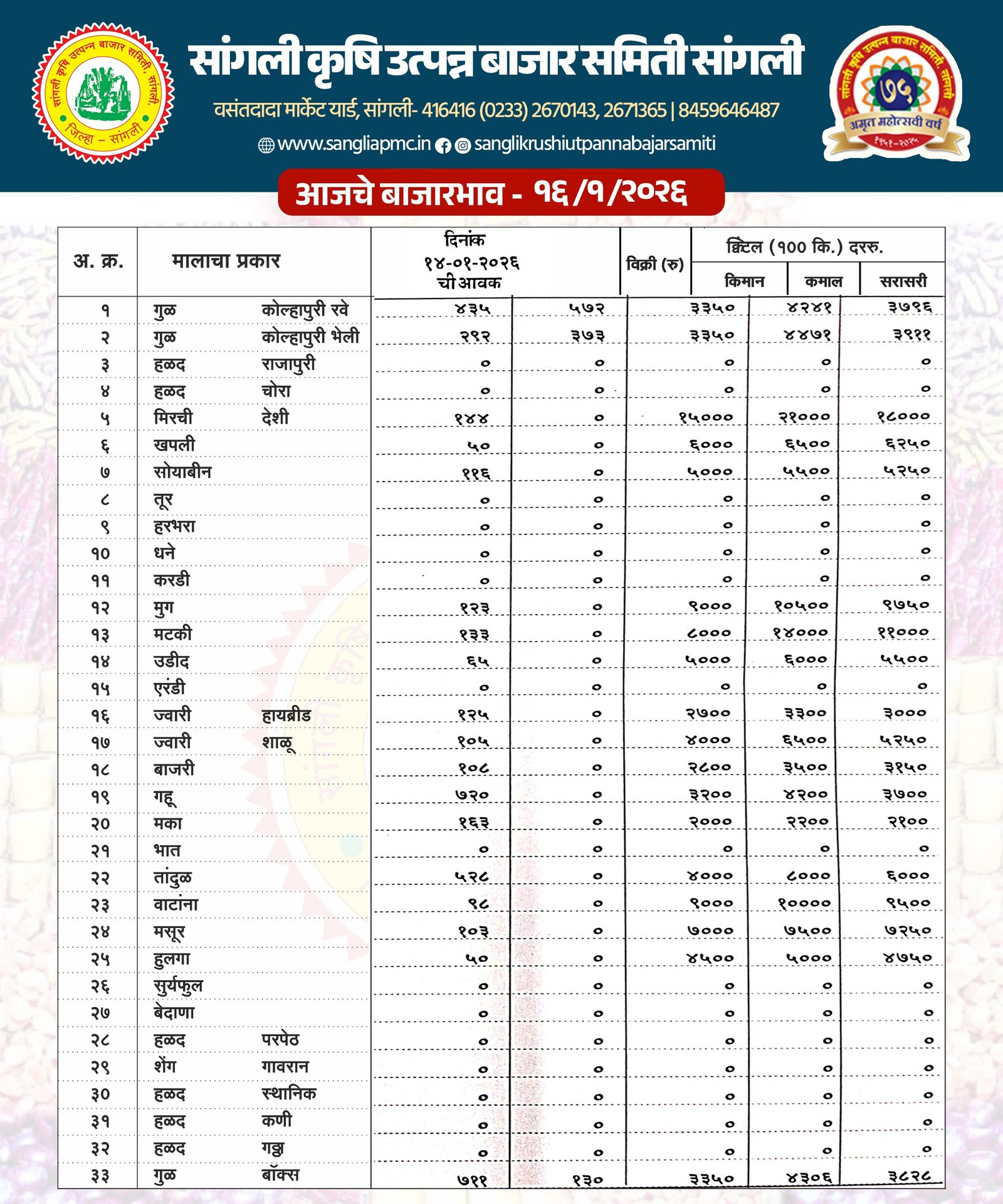| 16/01/2026 | सांगली कृषि उत्पन्न बाजार समिती, सांगली | बाजारभाव पहा |