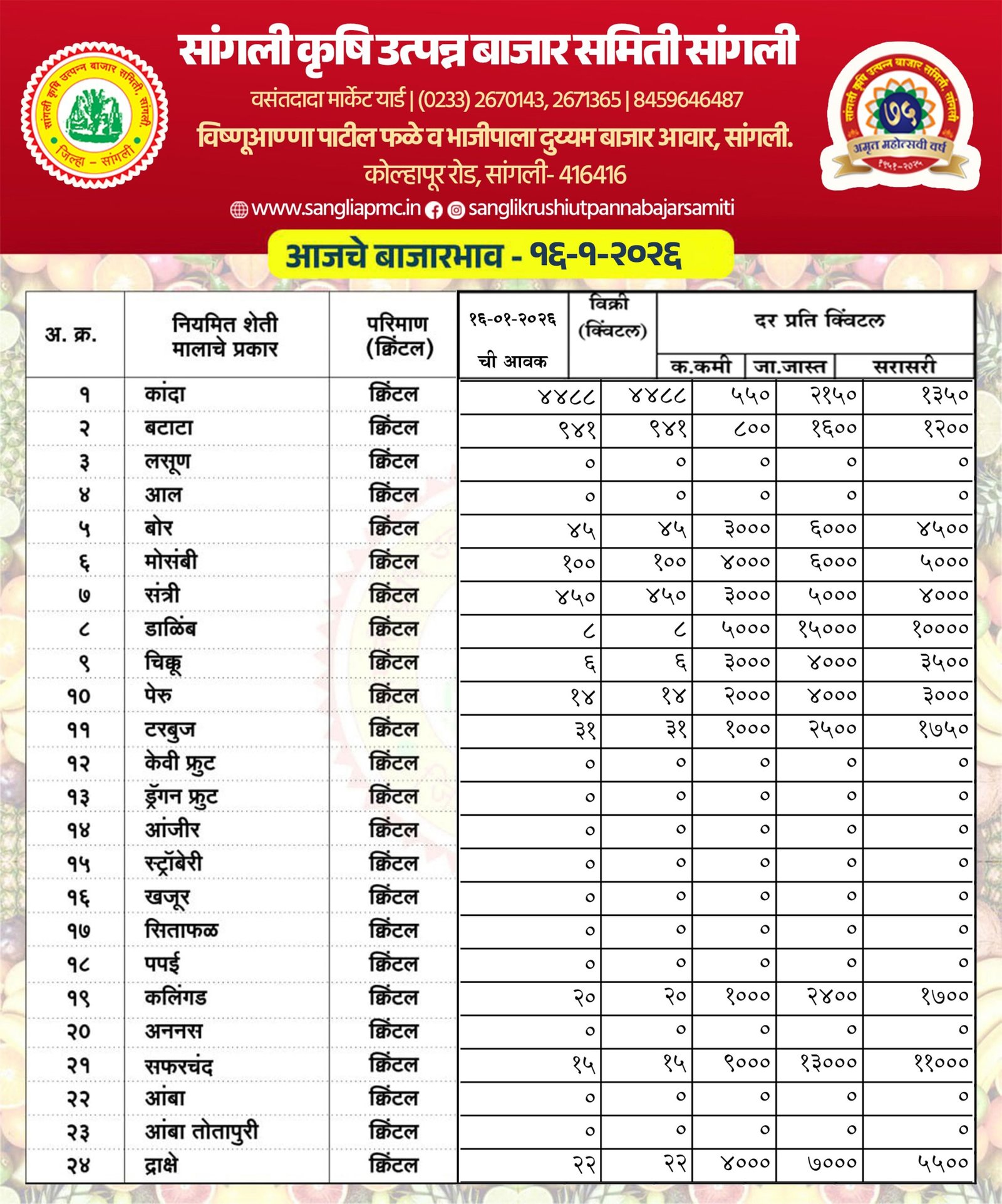 | 16/01/2026 | विष्णूआण्णा पाटील फळे व भाजीपाला दुय्यम बाजार आवार, सांगली. | बाजारभाव पहा |
