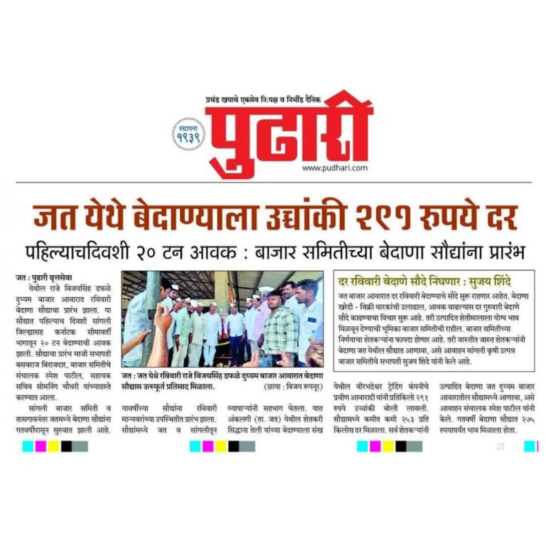 जत येथील राजे विजयसिंह डफळे दुय्यम बाजार आवारात रविवार दिनांक-०२/०३/२०२५ रोजी बेदाणा सौद्याचा प्रारंभ झाला. सौद्यात पहिल्याच दिवशी सांगली जिल्ह्यासह कर्नाटक सीमावर्ती भागातून २० टन बेदाण्याची आवक झाली. सौद्याचा प्रारंभ माजी सभापती बसवराज बिराजदार, बाजार समितीचे संचालक रमेश पाटील, सहायक…